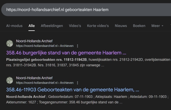 Een doorgaans goed werkende zoekstrategie voor Noord Hollandse gemeenten is de Google zoekaktie: https://noord-hollandsarchief.nl geboorteakten stad. Zo levert zoeken naar https://noord-hollandsarchief.nl geboorteakten Haarlem het volgende op: